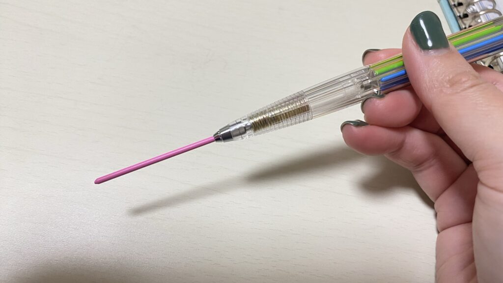 シャープペンと同じ感覚で使えますが、色芯はやわらかめなので、少しだけ出して使うと折れにくくなります。