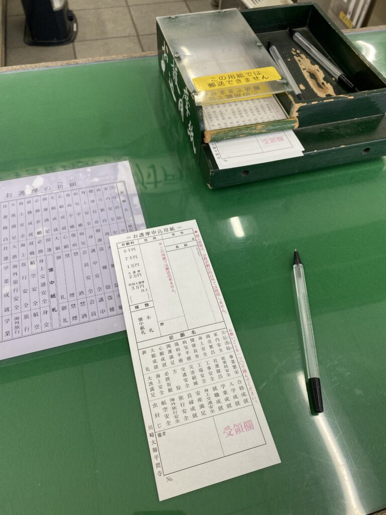 受付はわかりやすい場所にあり、用紙に名前・住所・願意(厄除けなど)を記入して祈祷料を納めます。